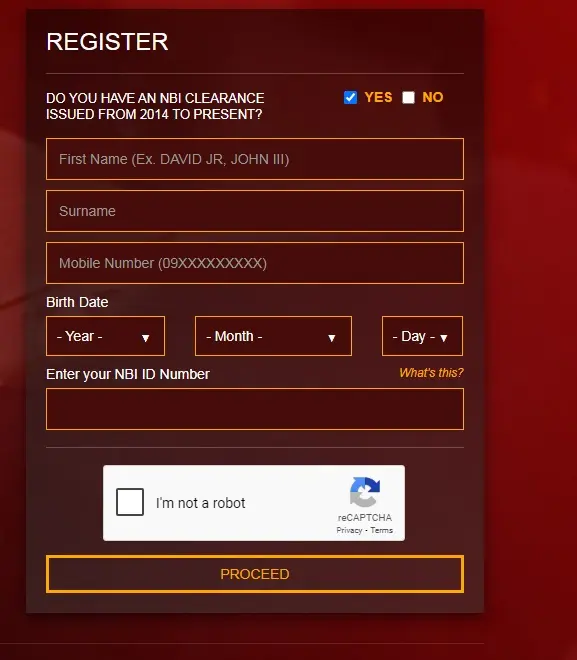 Applicants who were issued NBI Clearance in 2014 or later can use their previous NBI ID number to register.